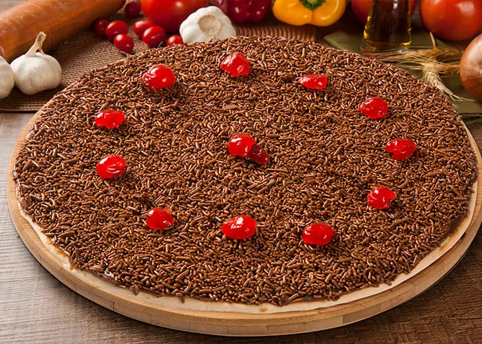 Um clássico de origem brasileira, o brigadeiro é uma das pizzas mais pedidas e populares. Nem preciso dizer sobre a sua preparação, né?