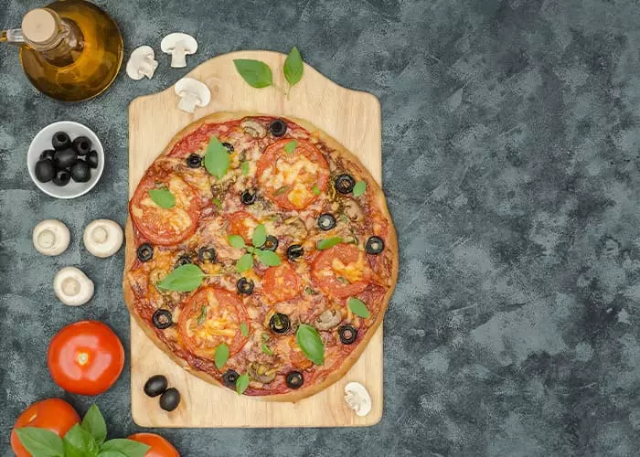 A preparação do recheio é feita com cogumelos, queijo muçarela, tomate, azeitonas e manjericão.