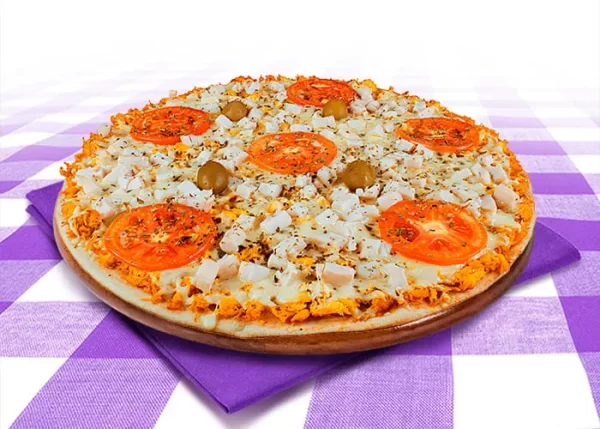Esse sabor é feito com molho de tomate, frango desfiado, queijo muçarela, palmito, tomate, azeitona e orégano.