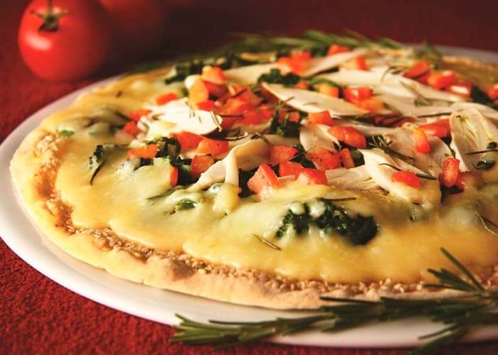 A pizza de palmito vegetariana pode levar molho de tomate, palmito, azeitona preta, alecrim, queijo muçarela e fatias de tomate.